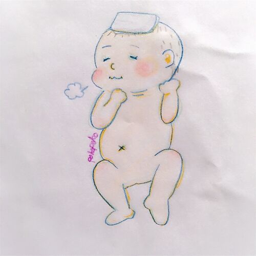 今日の一枚。 お風呂であたまにお尻拭き、可愛すぎた。 お風呂いれたときに旦那が体を拭くためのおしりふきを娘ちゃんのあたまに。 おしりふきのサイズ感がちょうどよくて、すごく可愛かったです。 落書き帳に描いたので紙のシワが…。 最近は、よくわからな…
